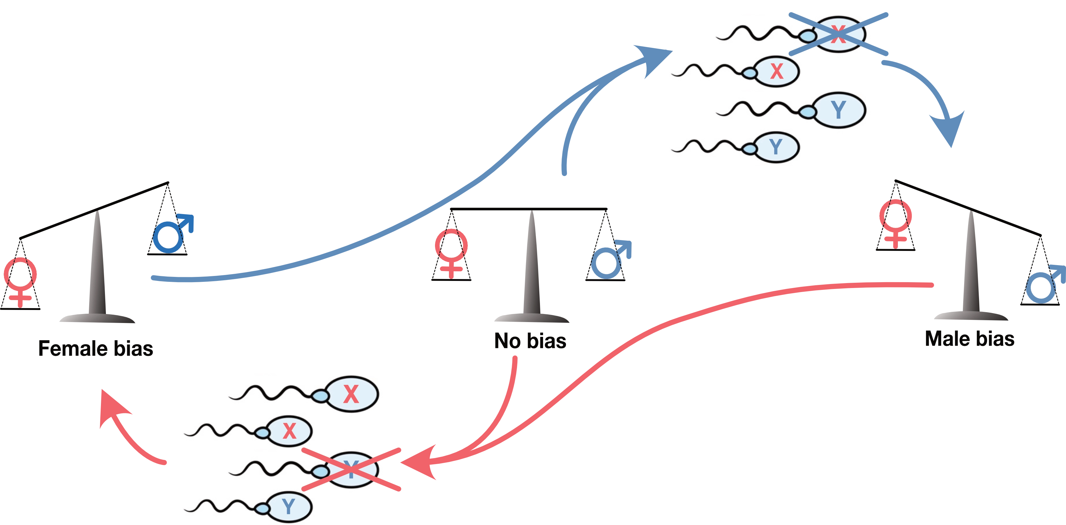 Sex-chromosome meiotic drive: Unlike the 22 chromosome pairs that carry the same genes and exchange gene variants before they separate into sperm cells, the X and Y sex chromosome evolve separately from each other making them evolutionary rivals. If an X gene variant can impair Y-bearing sperm the proportion of X carrying sperm will rise above 50% giving the man more daughters than sons. Since this gene variant transmits more gene copies to the next generation than variants that do not impair Y-bearing sperm, it spreads through the population. We call this "meiotic drive" but it is really just natural selection with the twist that it benefits only the "X-driving" gene variant. An X-driver need not invent any novel function. It just needs a mutation that breaks some cellular function in a way that is slightly worse for the Y-carrying sperm. Just like X drivers, an Y-driver will promote the transmission of Y chromosomes, setting up a arms race between X and Y for the control of the transmission ratio.